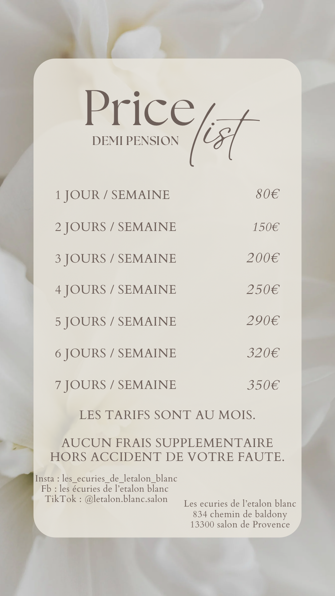 L'hébergement dans un paddock individuel (15x45), le foin a volonté ,la surveillance et l'accès aux installations équestres.